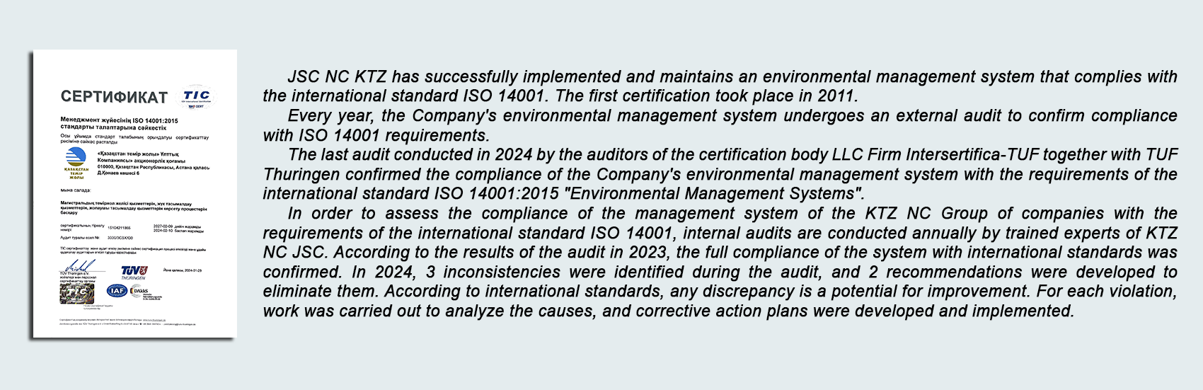 The railway mode of transport is the most environmentally friendly mode of transport in the world. Despite this, NC KTZ JSC is aware of the importance of carrying out its production activities without compromising the environment, ecology and the quality of life of the future generation.