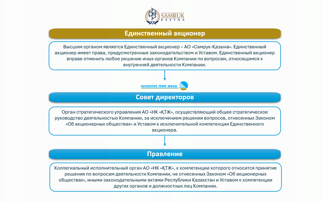 АО «НК «ҚТЖ» уделяет особое внимание вопросам корпоративного управления, осознавая, что его эффективность напрямую влияет на устойчивость и успешное развитие компании. Взаимодействие между акционерами, руководством и сотрудниками рассматривается как ключевой элемент стратегии, направленной на создание благоприятной и прозрачной корпоративной культуры.