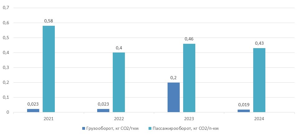 Интенсивность выбросов парниковых газов (Scope и Scope2) на тонно-километр и пассажиро-километр